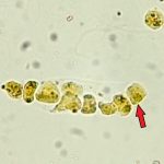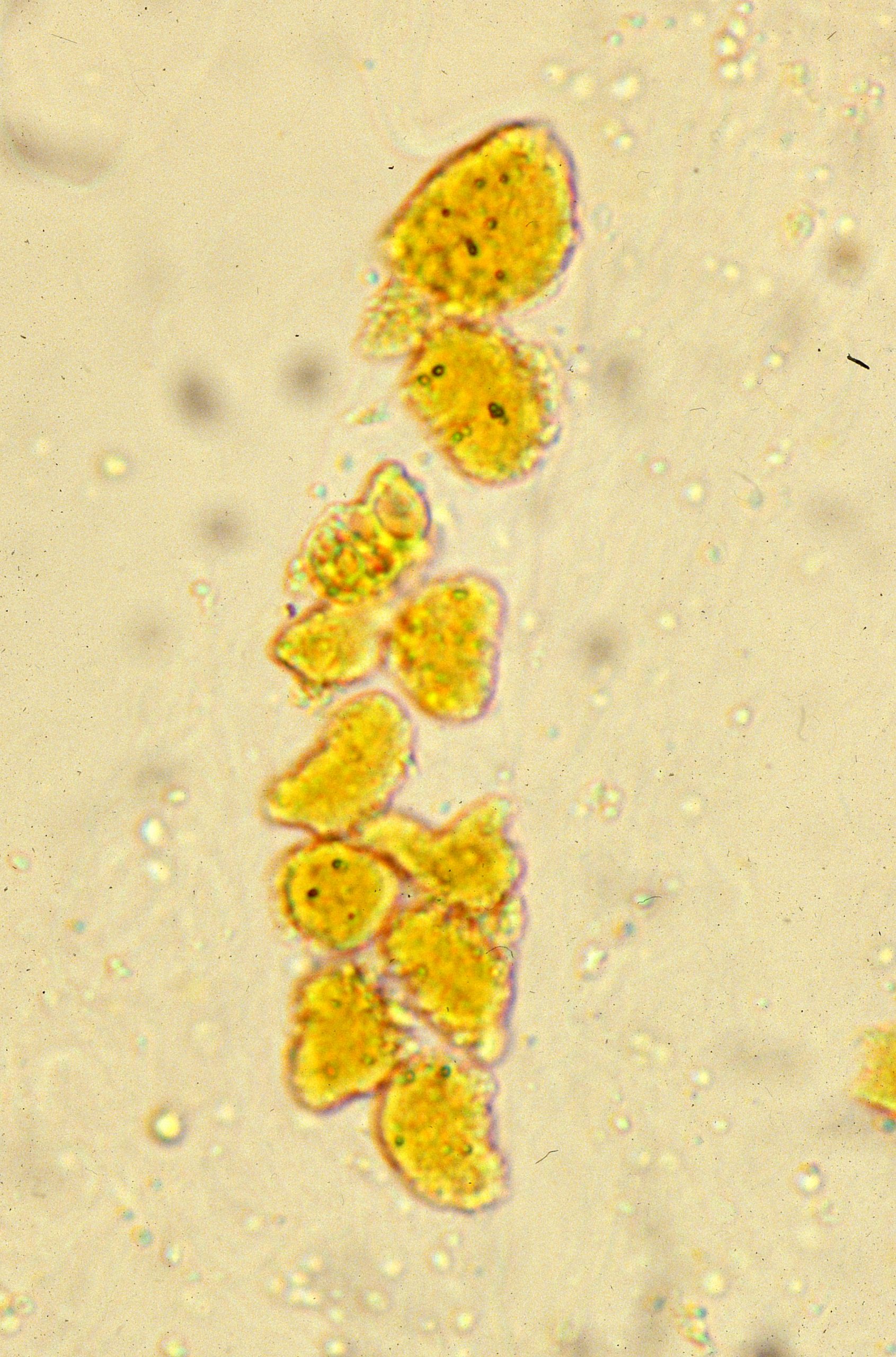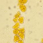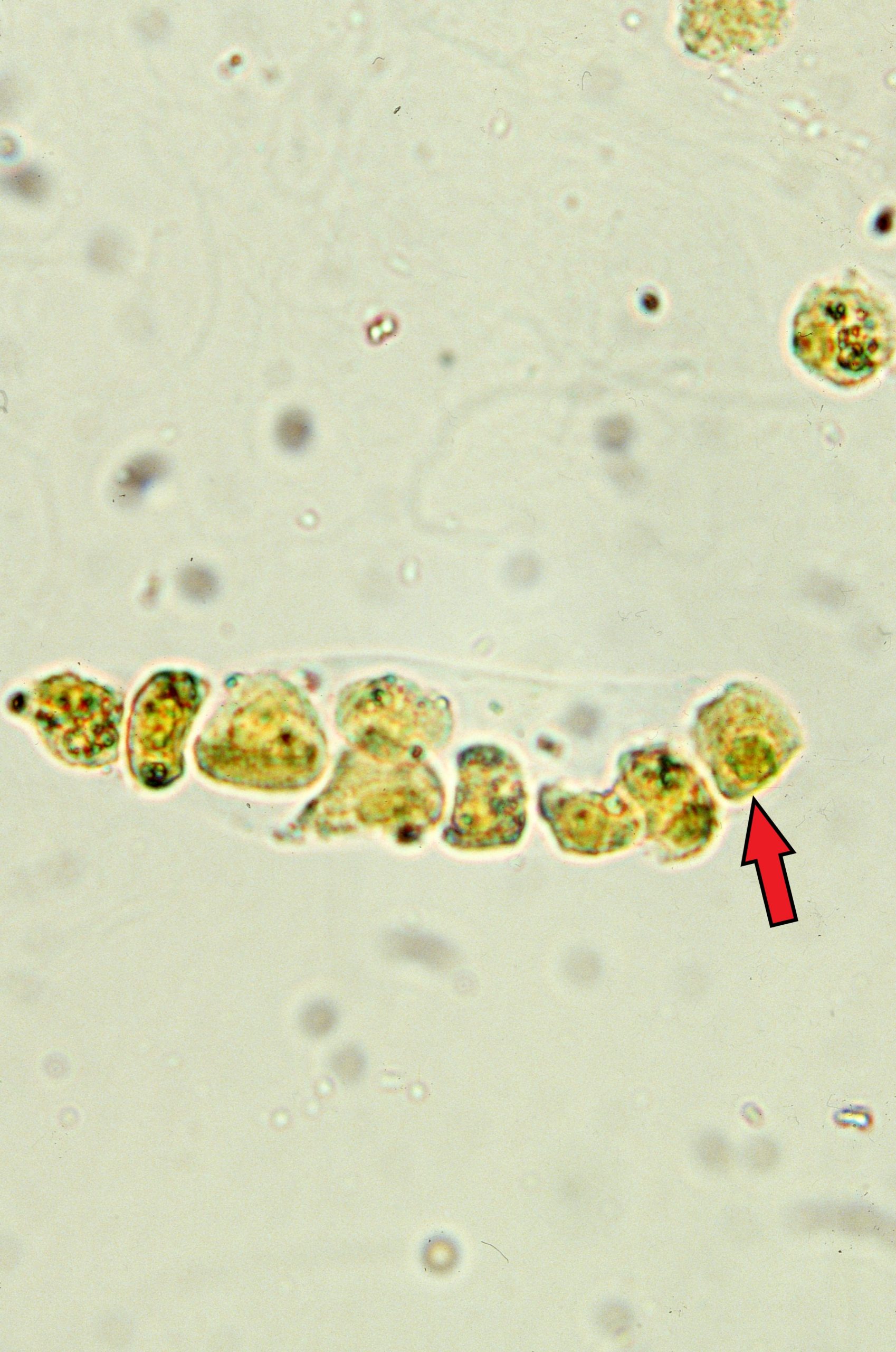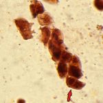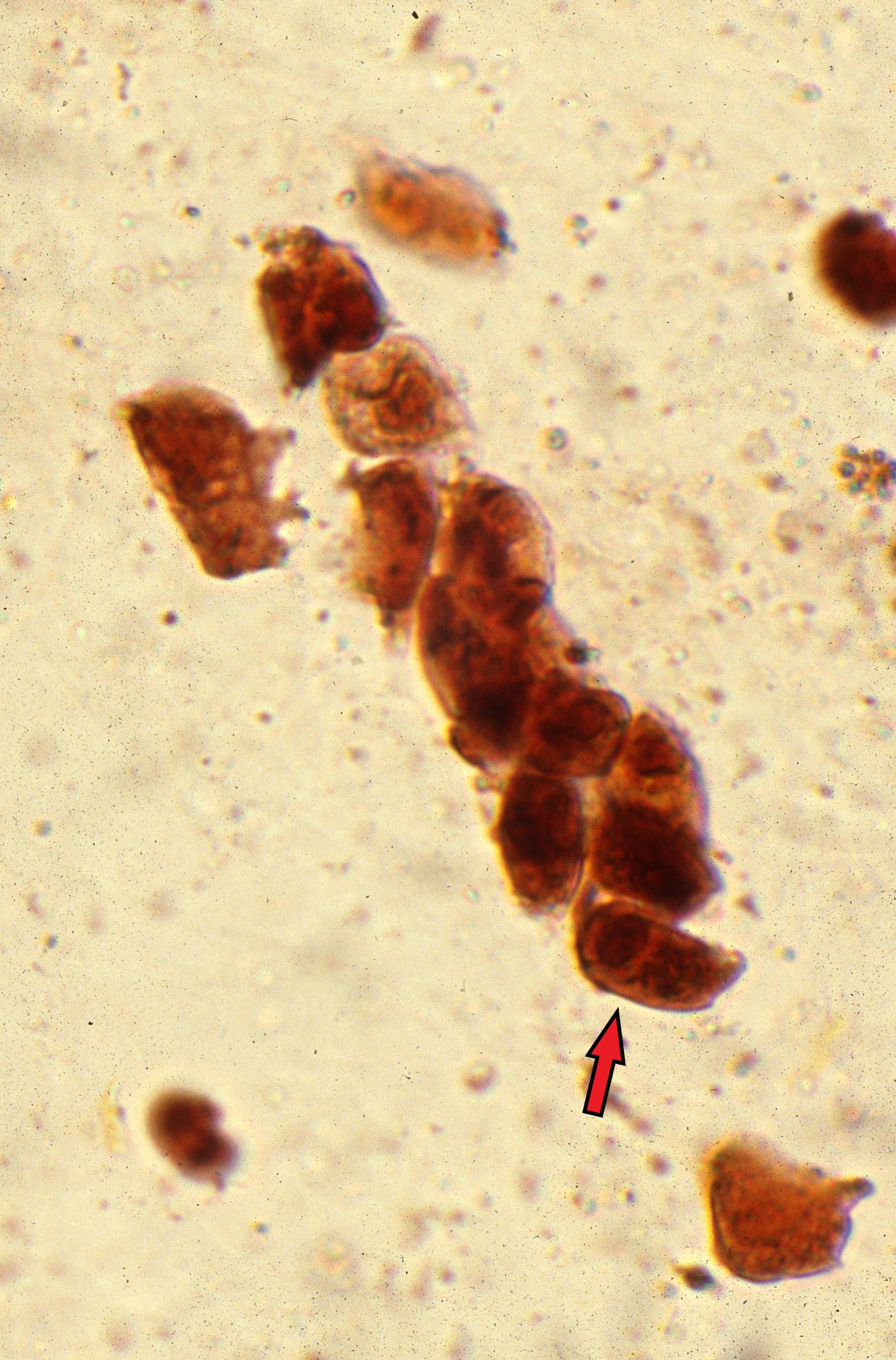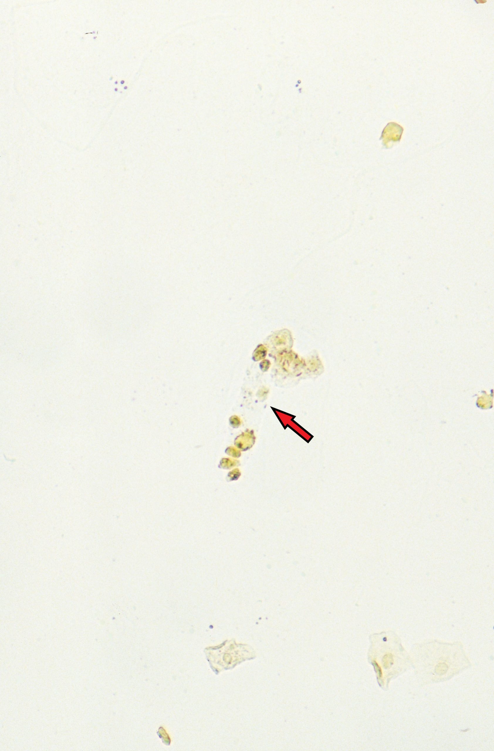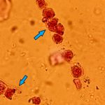 MAG 40X Arrow point to epi cell with bilirubin crystals